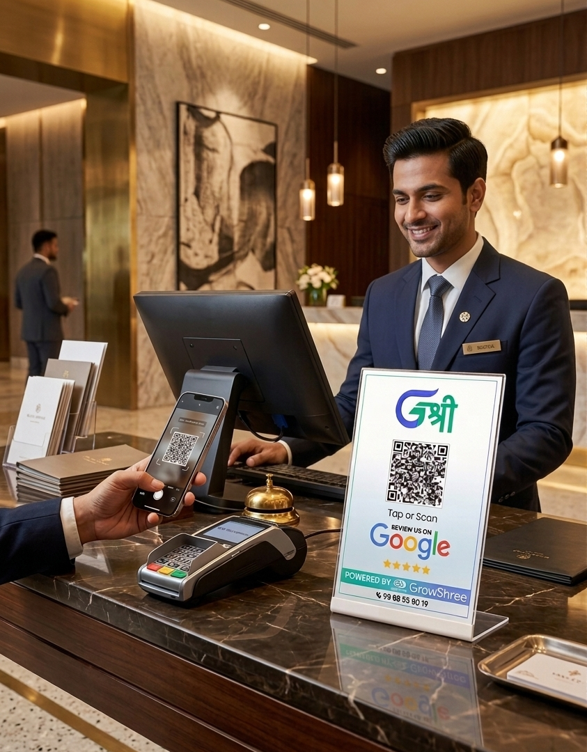 The GrowShree AI Review Booster Standee is a smart, modern solution designed to help businesses collect more Google reviews effortlessly. Placed on your reception desk, billing counter, or table, this standee allows customers to instantly scan the QR code and leave a review in seconds.